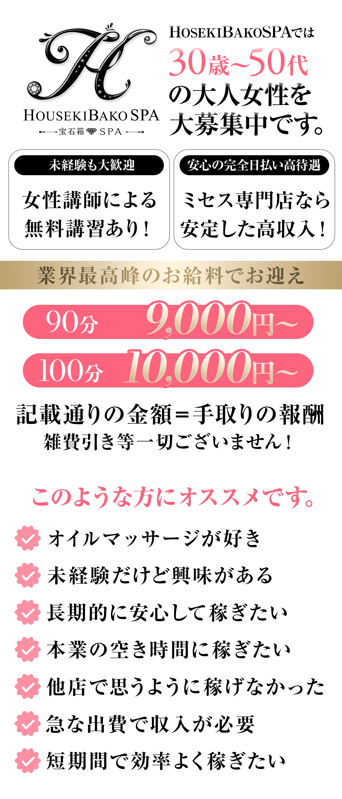 当店はセラピストさんの働きやすさを第一に考えて運営致しておりますので、ノルマ等心配することなくご自身のペースで働いて頂けます。 - お給料からの雑費引きなどはありますか?